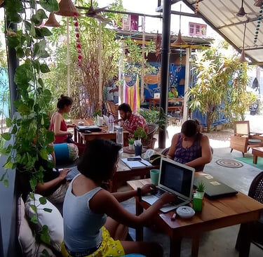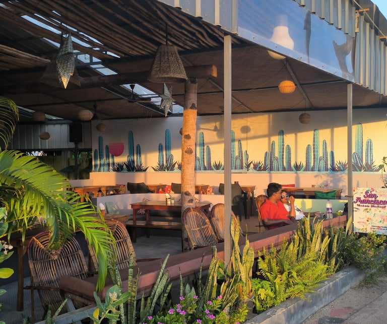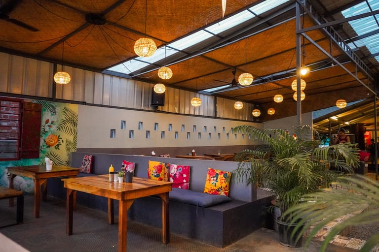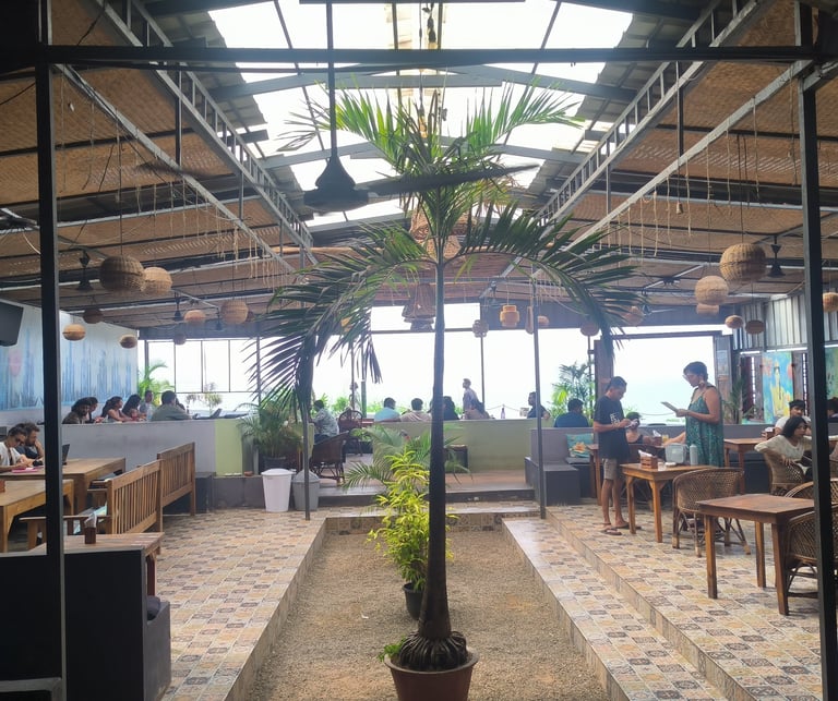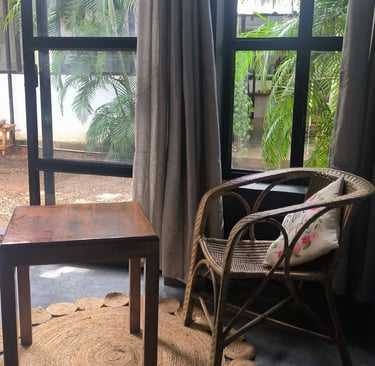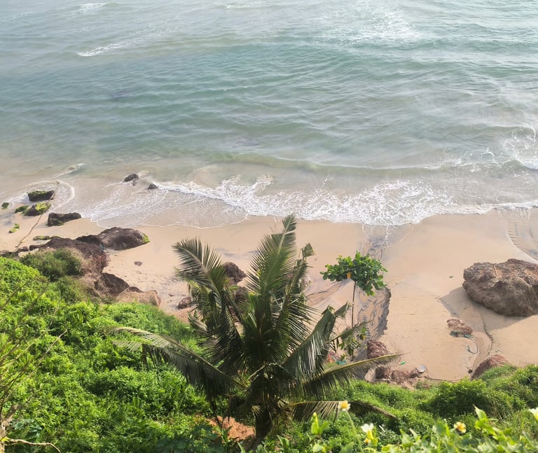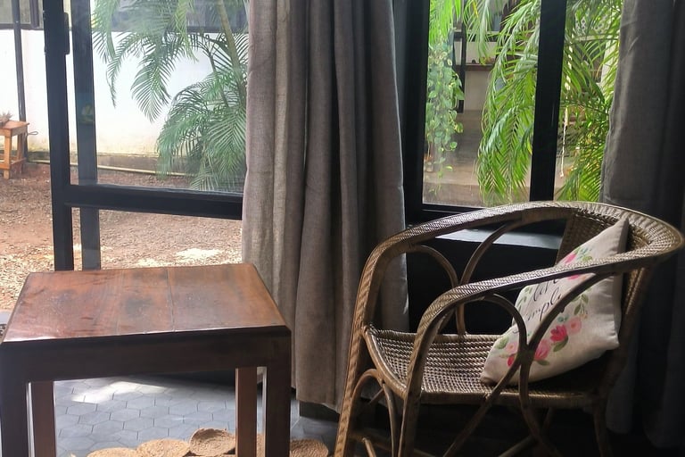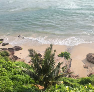 Walk down the alley from the Cliff and suddenly the world shifts. The noise fades, the air softens while you are stepping into a quiet green oasis tucked just behind the rhythm of varkala's Cliff.