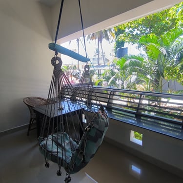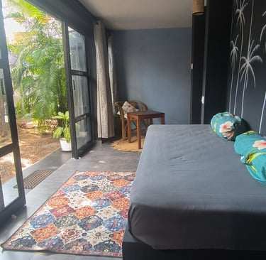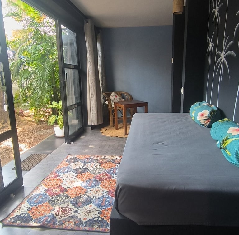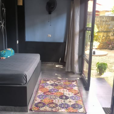Experience a basic yet comfortable room for little money and enjoy the same facilities on-site like all other guests - this room is ideal for couples or solo travelers seeking who spend most of the time anyway outside exploring. This small but cosy rooms offer a ceiling fan, 2 opposing windows for best ventilation, a queen-size bed, a private bathroom without hot water facility (the water is almost always at least luke warm), and a shared balcony/ terrace with hammocks and beanbag lounger designed for both relaxation and style.